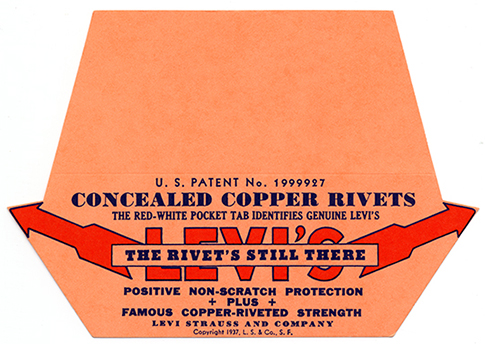 First introduced in 1936, this device was meant to differentiate Levi’s® jeans from the many competitors in the marketplace who were also using dark denim, a waistband patch and an Arcuate stitch. And in response to consumers who complained that their jeans were scratching their furniture and saddles, Levi’s® began sewing the back pockets so that they covered the rivets. To emphasize this point, they introduced the first pocket flasher. Made in the famous salmon color and placed into the right back pocket, the flasher had arrows pointing to the corners of the pockets with the words, “The Rivet’s Still There.” In-store advertising and retailer mailings emphasized this innovation.Design Details